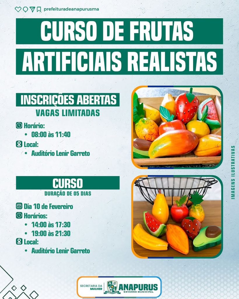 A Secretaria Municipal da Mulher convida você para participar do Curso de Frutas Artificiais, uma oportunidade incrível para aprender técnicas artesanais e desenvolver novas habilidades! 🎨🖌️
