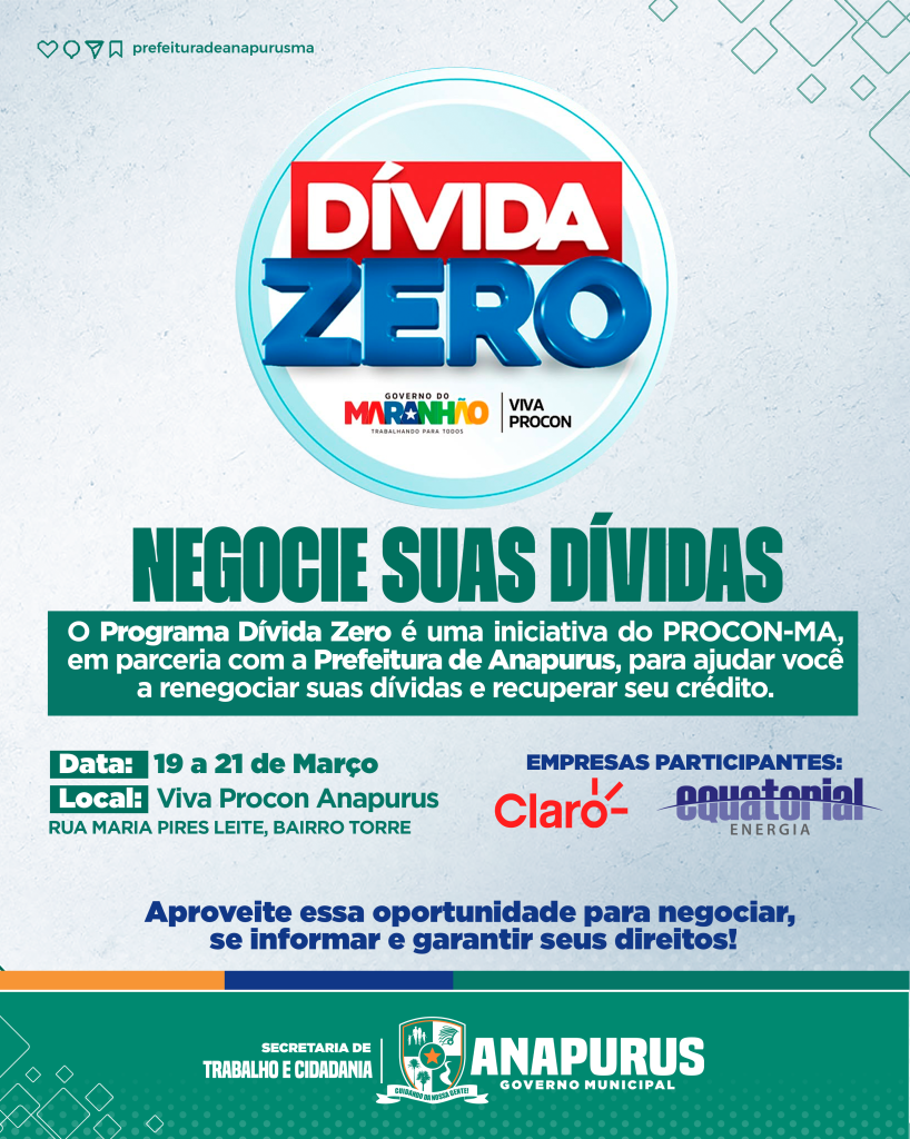 O Programa Dívida Zero é uma iniciativa do PROCON-MA, em parceria com a Prefeitura de Anapurus, para ajudar você a renegociar suas dívidas e recuperar seu crédito.
